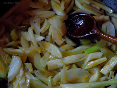 Főjön szépen puhára, max. ¼ óra, nem több. Közben fűszerezésnek mehet bele só, bors, tárkony, citromlé, petrezselyem, no meg édeskömény-virágzat, amit hívnak az angyalok fűszerének is, de magyarul nem tudom, hogy nevezik rendesen, meg egyáltalán, lehet-e itthon kapni.