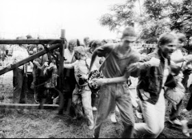 A Páneurópai Piknikre érkezett kelet-német turisták 1989. augusztus 19-én átszaladnak a Magyarország és Ausztria közötti műszaki határzár (a "vasfüggöny") kinyíló kapuján, Sopronpusztánál.